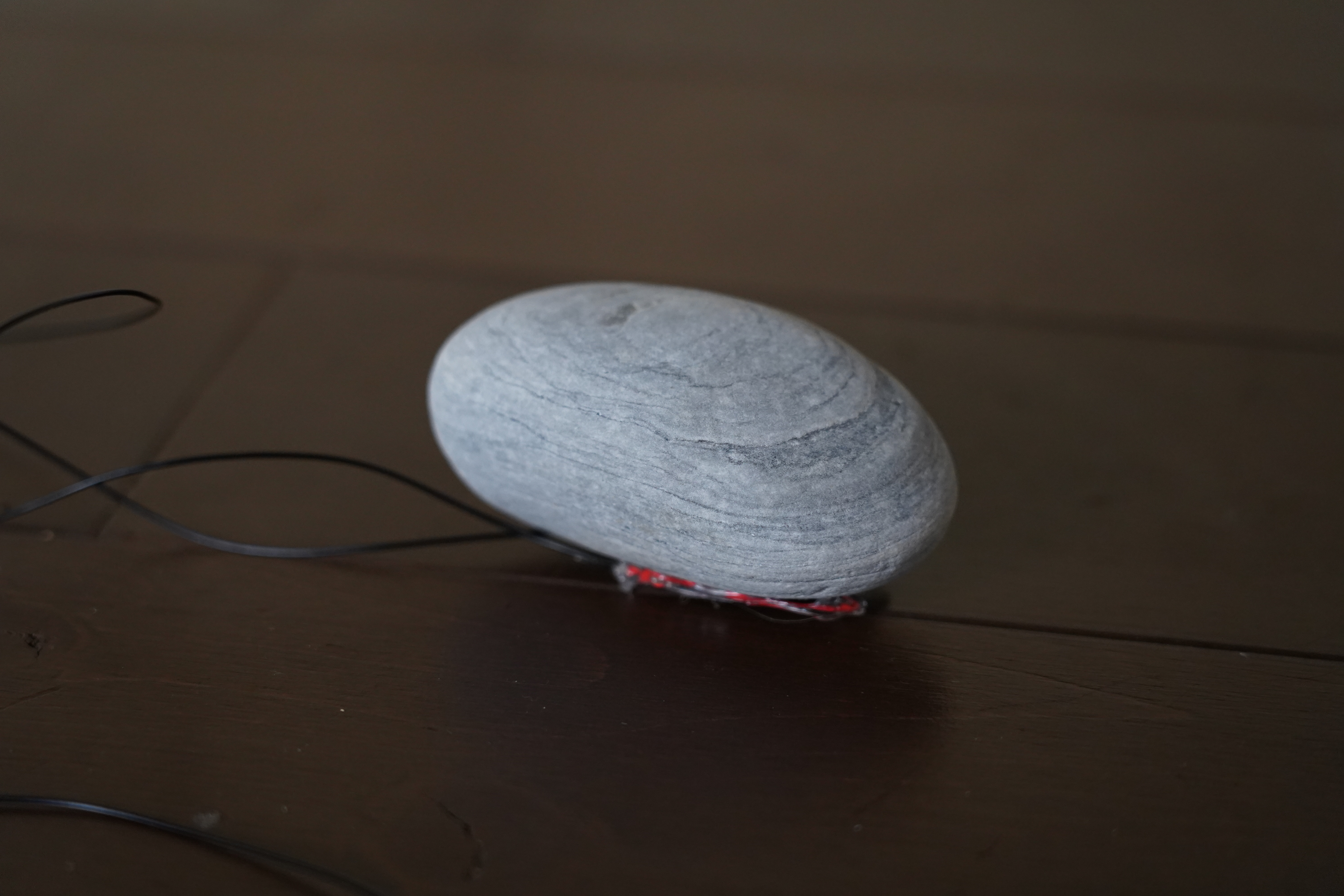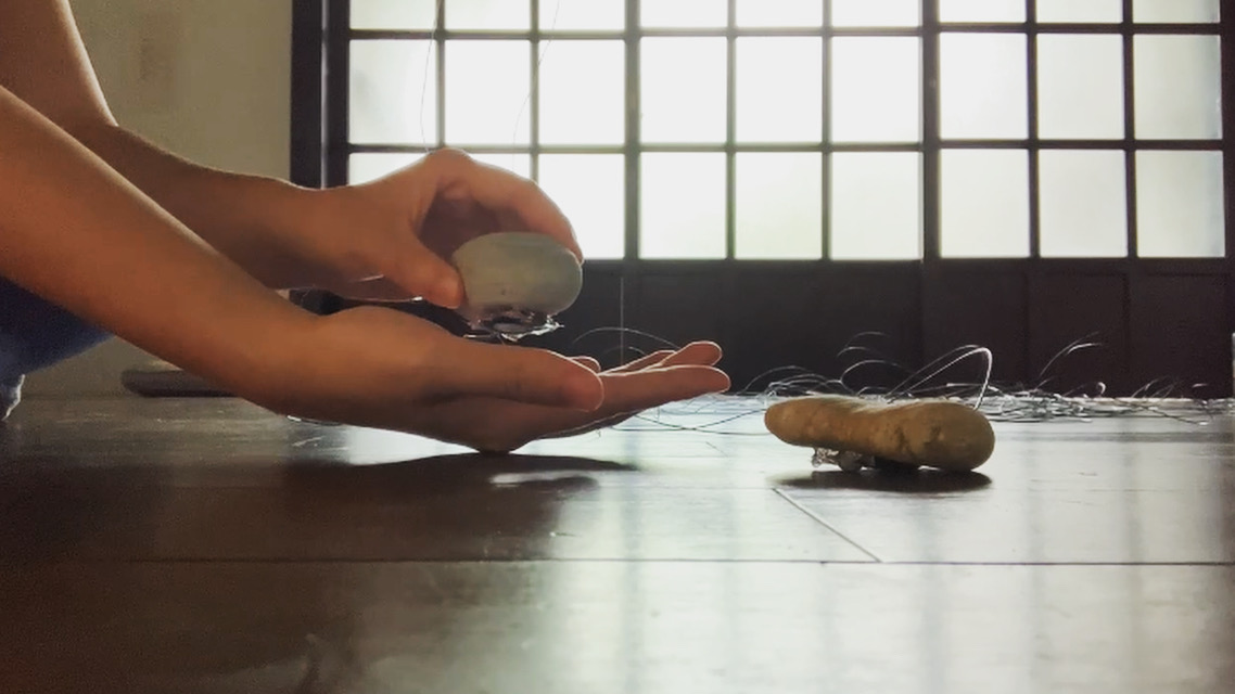 《聆聽孔隙:( ) listening pores: () 》系列透過自製的接觸式麥克風錄下了石頭裡振動的海水,石頭與石頭間的孔隙成為了濾波器(filter),收錄的海潮聲與空氣作為介質傳至耳中的聲響有著極其不同的質地。將石頭裝置放在手上,兩種身體的孔隙作為聆聽的想像通道,石頭裡振動的海水透過觸摸而再次被聽見──人類的身體成為共鳴箱,手心與石頭的接觸距離調變濾波,聆聽穿梭孔隙之間。